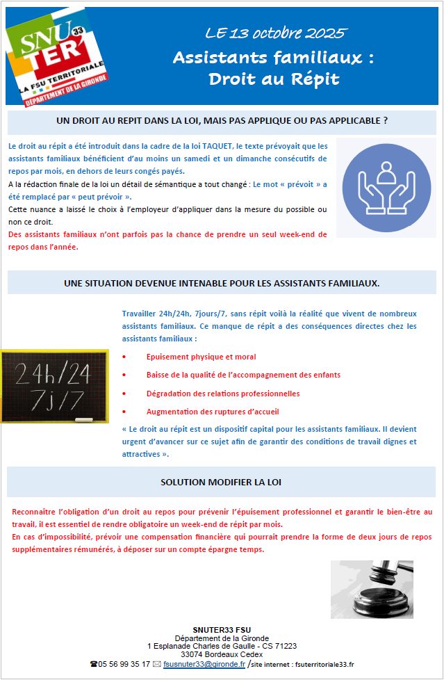 Assistants familiaux : Droit au répit par Isabelle Mathieu | Oct 14, 2025 | DGAS, Le Département de la Gironde, Les actualités | 0 commentaires UN DROIT AU REPIT DANS LA LOI, MAIS PAS APPLIQUE OU PAS APPLICABLE ? FacebookPost on XFollow usSave Poster le commentaire Annuler la réponseVotre adresse e-mail ne sera pas publiée. Les champs obligatoires sont indiqués avec *Commentaire * Nom * E-mail * Site web Enregistrer mon nom, mon e-mail et mon site dans le navigateur pour mon prochain commentaire. Δ
