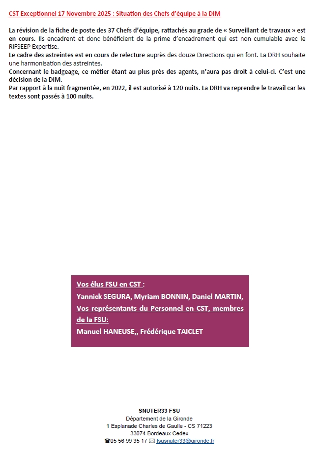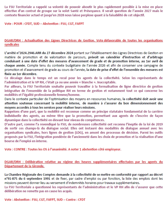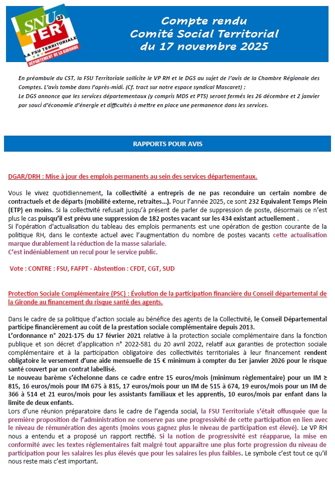 Compte Rendu du CST du 17 Novembre 2025 par Isabelle Mathieu | Nov 25, 2025 | INSTANCES, Le Département de la Gironde, Les actualités | 0 commentaires FacebookPost on XFollow usSave Poster le commentaire Annuler la réponseVotre adresse e-mail ne sera pas publiée. Les champs obligatoires sont indiqués avec *Commentaire * Nom * E-mail * Site web Enregistrer mon nom, mon e-mail et mon site dans le navigateur pour mon prochain commentaire. Δ