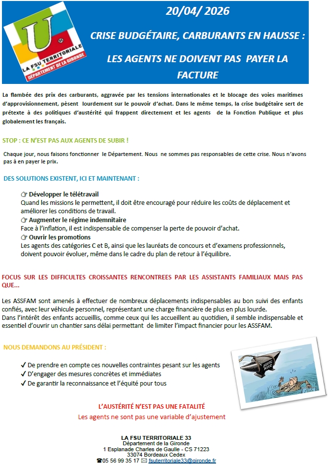 Crise budgétaire, hausse du carburant : Les agents ne doivent pas payer la facture par Isabelle Mathieu | Avr 20, 2026 | Les actualités | 0 commentaires FacebookPost on XFollow usSave Poster le commentaire Annuler la réponseVotre adresse e-mail ne sera pas publiée. Les champs obligatoires sont indiqués avec *Commentaire * Nom * E-mail * Site web Enregistrer mon nom, mon e-mail et mon site dans le navigateur pour mon prochain commentaire. Δ Ce site utilise Akismet pour réduire les indésirables. En savoir plus sur la façon dont les données de vos commentaires sont traitées.