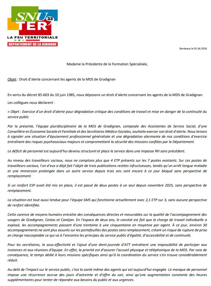 Droit d’Alerte MDS de Gradignan par Isabelle Mathieu | Avr 2, 2026 | Les actualités | 0 commentaires FacebookPost on XFollow usSave Poster le commentaire Annuler la réponseVotre adresse e-mail ne sera pas publiée. Les champs obligatoires sont indiqués avec *Commentaire * Nom * E-mail * Site web Enregistrer mon nom, mon e-mail et mon site dans le navigateur pour mon prochain commentaire. Δ Ce site utilise Akismet pour réduire les indésirables. En savoir plus sur la façon dont les données de vos commentaires sont traitées.