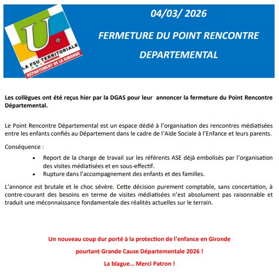 Fermeture du Point Rencontre Départemental par Isabelle Mathieu | Mar 9, 2026 | DGAS, Le Département de la Gironde, Les actualités | 0 commentaires FacebookPost on XFollow usSave Poster le commentaire Annuler la réponseVotre adresse e-mail ne sera pas publiée. Les champs obligatoires sont indiqués avec *Commentaire * Nom * E-mail * Site web Enregistrer mon nom, mon e-mail et mon site dans le navigateur pour mon prochain commentaire. Δ Ce site utilise Akismet pour réduire les indésirables. En savoir plus sur la façon dont les données de vos commentaires sont traitées.