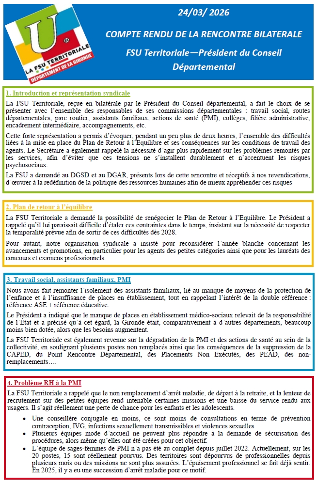 La FSU Territoriale rencontre le Président du Conseil Départemental de la Gironde