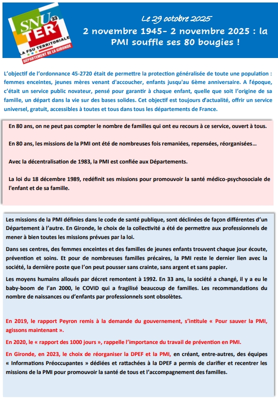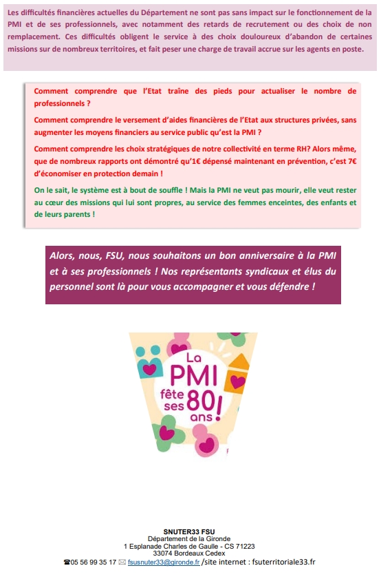 La PMI fête ses 80 ans ! par Isabelle Mathieu | Oct 31, 2025 | DGAS, Le Département de la Gironde, Les actualités | 0 commentaires FacebookPost on XFollow usSave Poster le commentaire Annuler la réponseVotre adresse e-mail ne sera pas publiée. Les champs obligatoires sont indiqués avec *Commentaire * Nom * E-mail * Site web Enregistrer mon nom, mon e-mail et mon site dans le navigateur pour mon prochain commentaire. Δ