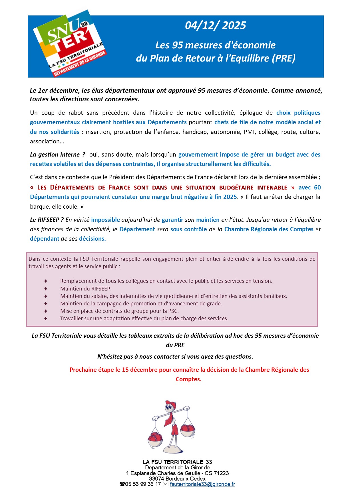 Les 95 mesures d’économie du Plan de Retour à l’Equilibre (PRE) par Isabelle Mathieu | Déc 4, 2025 | Le Département de la Gironde, Les actualités | 0 commentaires FacebookPost on XFollow usSave Poster le commentaire Annuler la réponseVotre adresse e-mail ne sera pas publiée. Les champs obligatoires sont indiqués avec *Commentaire * Nom * E-mail * Site web Enregistrer mon nom, mon e-mail et mon site dans le navigateur pour mon prochain commentaire. Δ Ce site utilise Akismet pour réduire les indésirables. En savoir plus sur la façon dont les données de vos commentaires sont traitées.