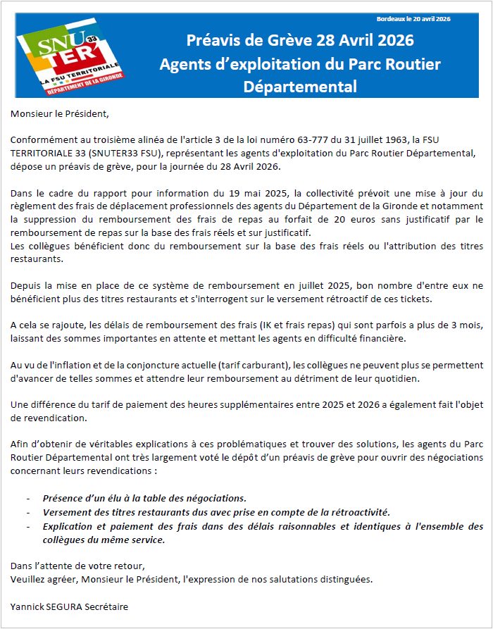 Préavis de grève pour les agents du Parc Routier Départemental par Isabelle Mathieu | Avr 22, 2026 | Les actualités | 0 commentaires FacebookPost on XFollow usSave Poster le commentaire Annuler la réponseVotre adresse e-mail ne sera pas publiée. Les champs obligatoires sont indiqués avec *Commentaire * Nom * E-mail * Site web Enregistrer mon nom, mon e-mail et mon site dans le navigateur pour mon prochain commentaire. Δ Ce site utilise Akismet pour réduire les indésirables. En savoir plus sur la façon dont les données de vos commentaires sont traitées.
