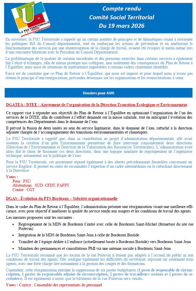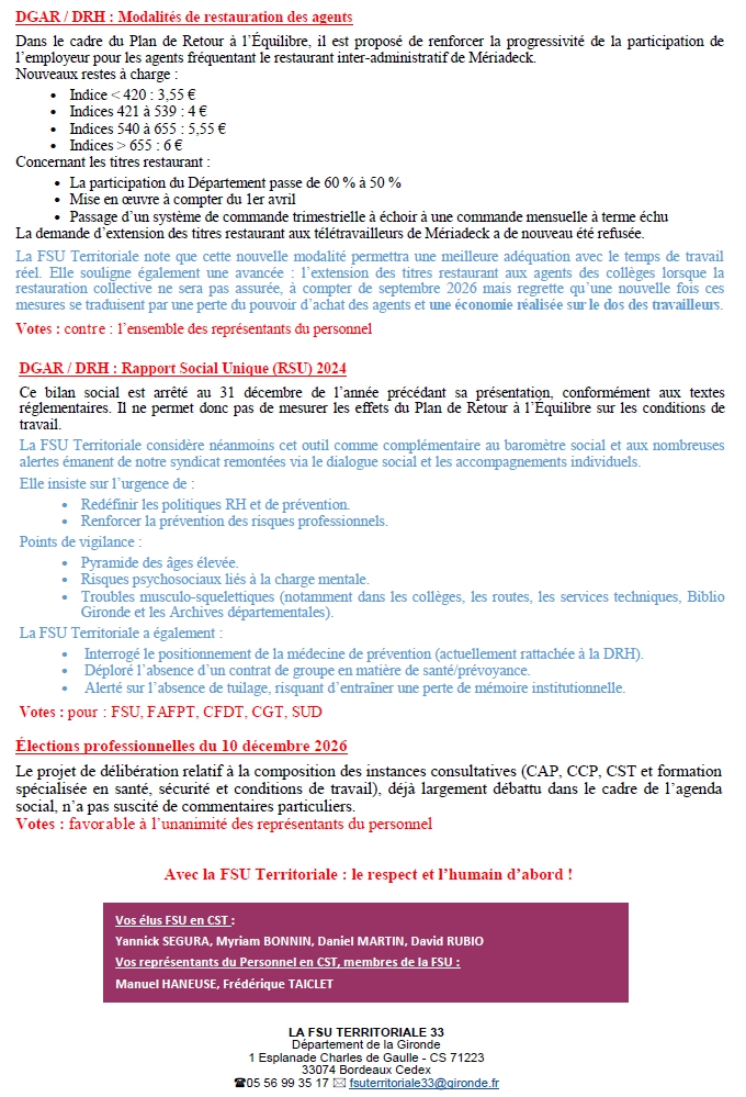 Restauration, PTS Bordeaux, Environnement, bilan social… Compte rendu du CST 19 mars 2026