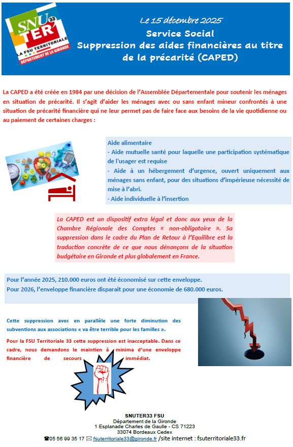 Suppression des aides financières au titre de la précarité (CAPED) au département de la Gironde par Isabelle Mathieu | Déc 22, 2025 | Les actualités | 0 commentaires FacebookPost on XFollow usSave Poster le commentaire Annuler la réponseVotre adresse e-mail ne sera pas publiée. Les champs obligatoires sont indiqués avec *Commentaire * Nom * E-mail * Site web Enregistrer mon nom, mon e-mail et mon site dans le navigateur pour mon prochain commentaire. Δ Ce site utilise Akismet pour réduire les indésirables. En savoir plus sur la façon dont les données de vos commentaires sont traitées.